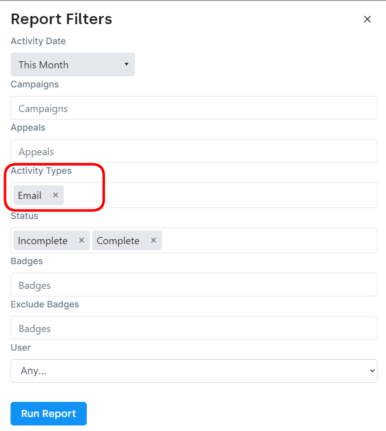 On the blue Filters pop up box, set Date Range, and reduce Activity Type to only Email